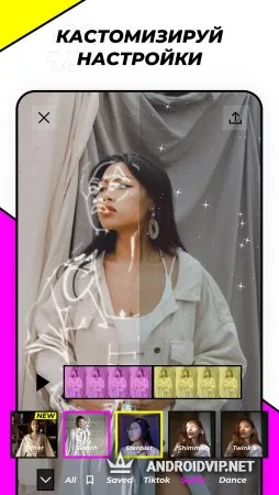 Делайте из обычных фотографий анимированные снимки благодаря специальным эффектам, а так же дорабатывайте фото и видео при помощи настроек контраста, насыщенности и других параметров. Спецэффекты включают в себя фильтры с блеском, неоном, инди-эстетикой, vhs эффектом и другие фильтры. Сохраняйте полученные результаты, делитесь ими в социальных сетях и следите за обновлениями.