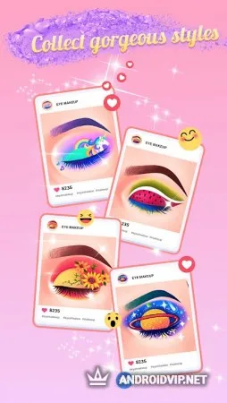 В верхней части экрана расположена фотография макияжа, который вам необходимо воссоздать. Используйте различные инструменты, кисточки и косметические средства, чтобы создать точно такой же образ. Наносите на веко тени, рисуйте подводкой стрелки, красьте ресницы тушью, оформляйте брови и не забывайте о ярких деталях в виде блёсток, рисунков и стикеров.