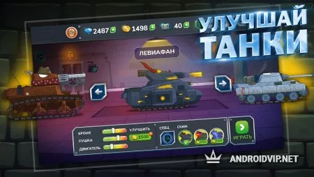 Перед тем, как начать участвовать в сражениях, вам нужно будет подобрать себе аватарку, имя пользователя и конечно же выбрать подходящий танк. В игре представлено множество различных видов танков, стилизованных под мультяшные - Челябинец, Кольт М5, Т-34-85, Дреб, Тигр, Вафля, Штейн и другие модели. У каждого танка есть свои характеристики, которые можно будет улучшать повышая их уровень, а так же дополнительно можно использовать специальные бустеры, увеличивающие урон и защиту.
