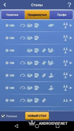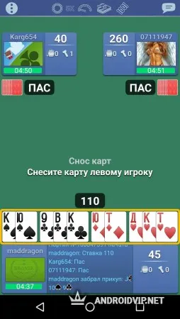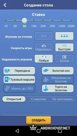 В игре могут участвовать два или три игрока в зависимости от настроек, которые вы укажите перед началом соревнования. Так же здесь можно настроить множество других параметров, в том числе скорость игры, ставку, надёжность игроков и так далее. Надёжных игроков от обычных отличает их предыдущее поведение во время партий - если они всегда доигрывают партии до конца и не оставляют других игроков, то система автоматически причисляет их к надёжным. Так же здесь есть возможность создавать столы с закрытым доступом по паролю или ссылке, чтобы играть с определёнными пользователями.