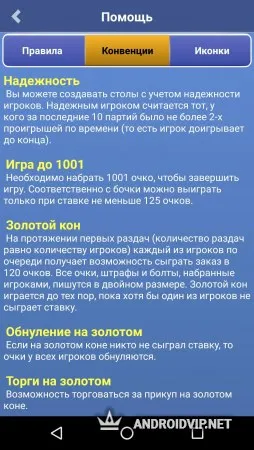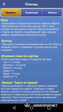 Перед тем, как вступить в игру, изучите раздел с правилами, где объясняются все основные моменты - игровые очки по картам, взятка, прикуп, торги за прикуп, игра до 1001, золотой кон и другие особенности. Главная цель этой карточной игры - набрать 1000 или более 1000 очков, сделав это быстрее чем ваши оппоненты. Используйте марьяжи (одноматсные король и дама), чтобы получить дополнительные очки и доберитесь до нужного числа самым первым.