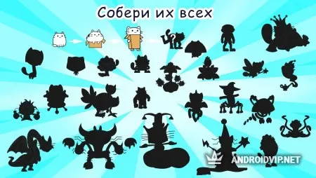 Открывая новые виды вы будете получать денежные награды. Используйте их для покупки кошек в магазине, чтобы расширить свой выбор для объединения. Так же вы можете приобретать различные бустеры, чтобы ускорить заработок, снизить цену на покупку котиков или же получить другие полезные бонусы.