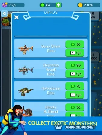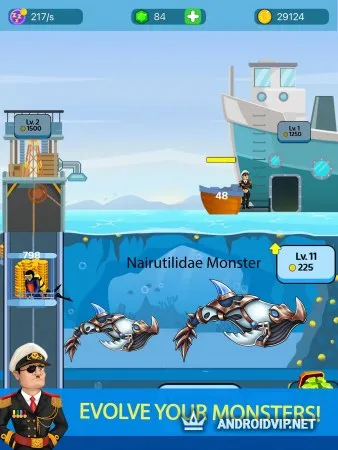 В игре представлены десятки морских монстров и динозавров, которых вы сможете приобретать и улучшать делая их больше и сильнее. Для того чтобы обеспечивать такой большой подводный зоопарк вам понадобятся ресурсы - добывайте золото, пополняйте свою копилку и используйте средства для развития своей империи. Так же у вас будет возможность отправлять динозавров в захватывающие сражения и получать ценные награды за победу.