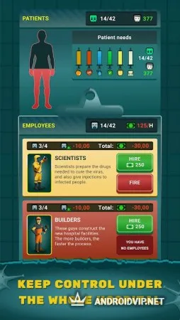 Нанимайте персонал, который будет выполнять различную работу в госпитале - от проведения разных процедур до ухода за больными. Вам понадобятся санитары, врачи, научные сотрудники, строители, уборщики и другие квалифицированные работники, являющиеся важной частью функционирования центра. Внимательно следите за состоянием каждого пациента, лечите их и находите разные занятия и развлечения. Не допускайте вспышек гнева, которые могут подорвать вашу работу, улучшайте своё оборудование, открывайте новые центры и вылечите как можно больше пациентов.