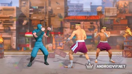 В игре реализовано классическое для файтингов управление - джойстик и несколько кнопок ударов и специальных приёмов, которые можно чередовать и совершать различные комбо. Перемещаясь по карте вы сможете собирать разные виды оружия - ножи, мечи, биты, пистолеты и так далее. Используйте их, чтобы нанести врагам урон, а так же задействуйте некоторые предметы окружающей среды.