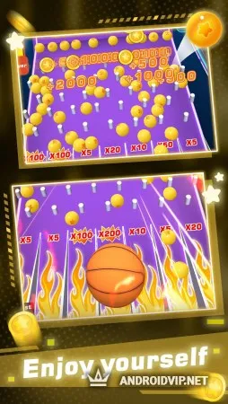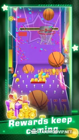У вас будут мячи двух типов, за броски с оранжевым мячом вы будете получать золотые монеты, а за броски с синими - бриллианты. Чем точнее попадание, тем больше наград получится выиграть. После совершения броска из корзины посыпятся монетки, которые затем попадут на различные дорожки. Каждая из дорожек будет увеличивать ваш выигрыш в зависимости от числа, указанного на ней.