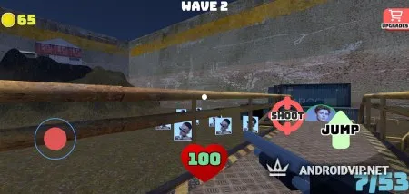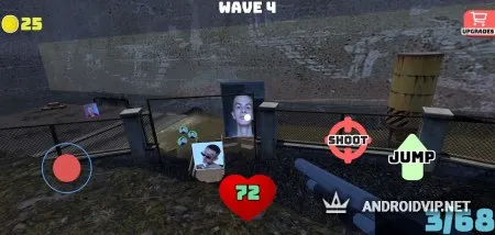 Игра имеет вид от первого лица, а значит вы словно сами окажетесь в гуще событий. Управление осуществляется при помощи джойстика и кнопок прыжка и выстрела. Враги представлены в виде фотографий с героями, в которые вам необходимо попадать. Перемещайтесь по игровому полю и нейтрализуйте противников, которые наступают волнами. Получайте денежные призы и используйте их для прокачки своего оружия.