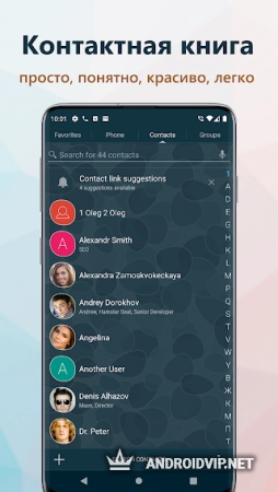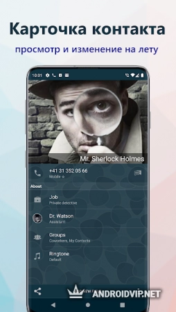 Данная утилита позволит вам сделать раздел контактов и стандартное приложение для звонков гораздо более удобным и функциональным. Управляйте своей телефонной книгой при помощи менеджера контактов - группируйте их, добавляйте в избранное и редактируйте. Добавляйте дополнительную информацию, которая будет отображаться рядом с именем контакта во время звонка. Просматривайте и редактируйте контакты в одном месте всего в несколько кликов.