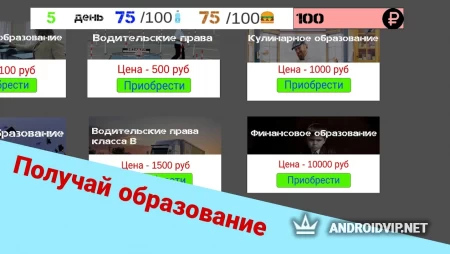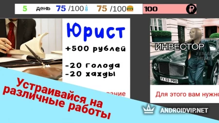 Каждый игровой день вас ждут не только новые испытания, но и возможности. Устраивайтесь на работу промоутером, дворником, таксистом, дальнобойщиком, поваром или даже юристом и инвестором. Каждая работа затрачивает определенные ресурсы, а так же требует освоения нужных навыков и умений. Заработав свои первые деньги стоит вложиться в образование - сдайте на водительские права, закончите кулинарные курсы или получите финансовое образование. Продолжайте развиваться, получайте больше денег и приобретайте свою первую недвижимость.