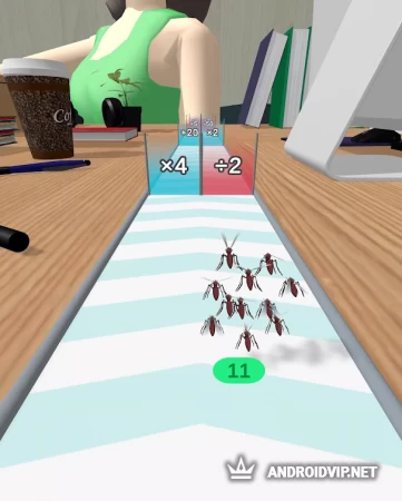 На всех ворота указаны числа и знаки в виде умножения, деления, вычитания и сложения. Во время прохождения вам нужно будет оценивать ворота и проходить через самые выгодные которые помогут вам увеличить количество комаров. Добравшись до конца трассы ваш отряд комаров сможет атаковать человека, а в зависимости от количества комаров вы получите игровые очки и награду.