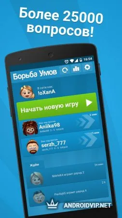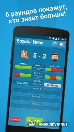 Борьба Умов - соревнуйтесь с друзьями в этой интересной викторине, которая проверит ваш уровень знаний. Огромное количество разнообразных вопросов из разных категорий, которые пополняются каждый день. Выбирайте правильные ответы и станьте лидером рейтинга самых умных игроков. Также есть возможность присылать свои собственные вопросы и получать призы.