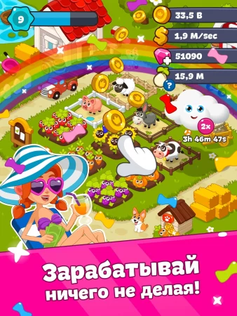Соберите целую коллекцию животных, среди которых есть овцы, курицы, коровы, гуси, поросята, кролики и другие. Собирайте урожай овощей, фруктов и ягод, продавайте его на местном фермерском рынке и получайте новые волшебные семена. Со временем вы сможете автоматизировать процесс производства и начать зарабатывать более внушительные суммы. Так же здесь можно генерировать пассивный доход даже тогда, когда вы находитесь не в сети.