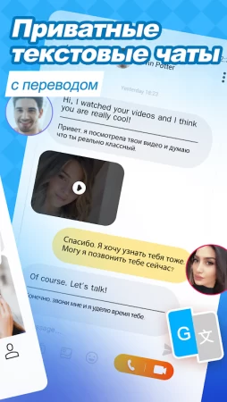 Видеозвонки и общение проходят в режиме 1на1, а всех интересных вам собеседников можно добавить в друзья, чтобы продолжить общение даже после завершения видеочата. Используйте различные фильтры, эффекты и стикеры, чтобы повеселиться или воспользуйтесь текстовым чатом, если нет настроения общаться при помощи видеозвонков. Так же здесь имеется встроенная функция перевода в реальном времени, что позволит пользователям преодолеть языковой барьер.
