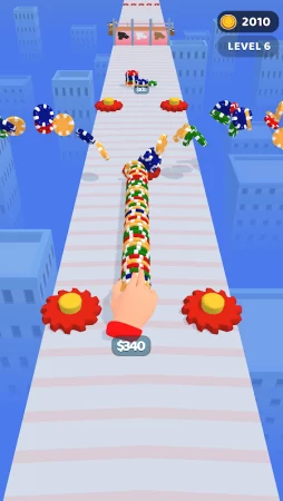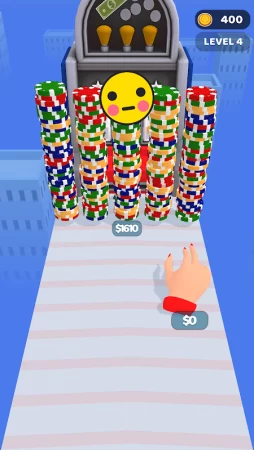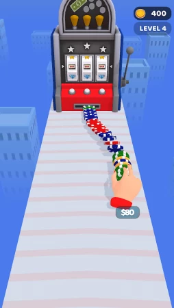 Геймплей здесь довольно простой в стиле классического казуального раннера, где вместо героя вы будете управлять рукой, а вместо обычных монеток нужно собирать фишки. Помимо этого в пути вас ждут небольшие азартные игры, которые часто являются настоящей лотерей и несут в себе элемент неожиданности. Старайтесь собрать как можно больше фишек, чтобы получить кругленькую сумму, которую затем можно задействовать в играх.