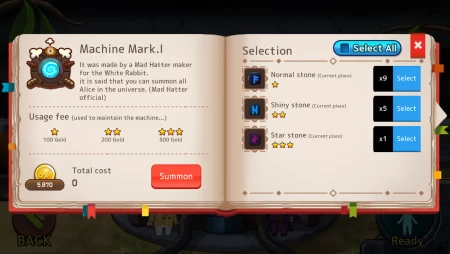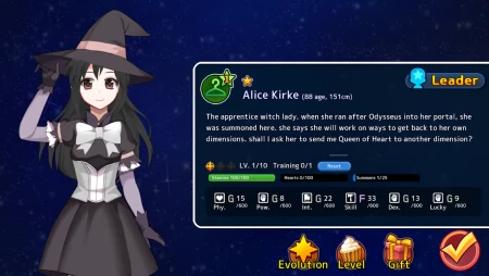 Машина действительно призывает Алису, правда каждый раз это не та самая Алиса, а самые разные девушки с таким же именем. Используйте Камни Призыва и отыщите нужную Алису. Призванных героинь можно улучшать и отправлять на различные миссии, чтобы получать золота и заветные Камни Призыва. Каждая Алиса по-своему уникальна, имеет оригинальную историю, внешний вид и даже озвучку.