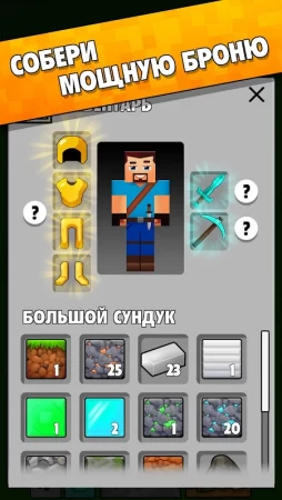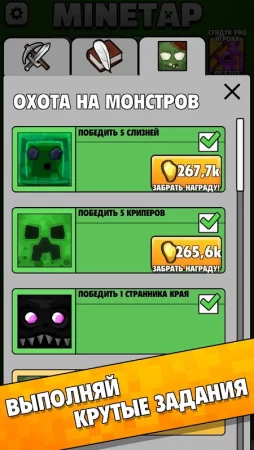 Помимо процесса добычи и крафтинга вы так же сможете участвовать в сражениях устроив настоящую охоту на монстров, но не забудьте перед этим добыть себе подходящую экипировку. Выполняйте задания и различные квесты, чтобы заполучить ценные награды. Победите несколько слизней или криперов и продвигайтесь к более сложным миссиям. Используйте бустеры, чтобы ускорить свой прогресс, приобретайте блоки и стройте свою деревню постепенно облагораживая её.
