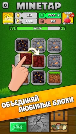 Minetap - это увлекательный кликер с пиксельной графикой, механикой слияния предметов и крафтом, который обязательно понравится поклонникам популярной песочницы. Отправляйтесь добывать различные ресурсы, создавайте новые предметы и экипировку, сражайтесь с монстрами и постройте своё собственное поселение!