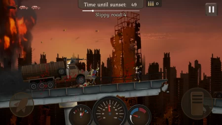 Используйте специальное оружие в виде ракет, огнемётов и острых насадок на капот, чтобы уничтожать зомби и все другие преграды на вашем пути. Включайте ускорение и пролетайте над препятствиями, ну и конечно же главное - успейте добраться до укрытия пока не село солнце. Каждый автомобиль имеет свои характеристики, все их можно улучшать и постепенно приобретать новые, более мощные тачки.