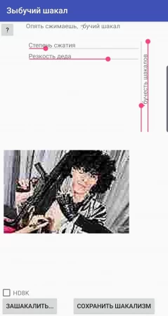 Опять сжимаешь, зыбучий шакал? Ну всё правильно, именно для этого и создано данное приложение. Нажимайте на кнопку "зашакалить" и загружайте нужные изображения, которые хотелось бы как следует зашакалить. Сжимайте их до пикселей, портьте качество, получайте за это ачивки и открывайте новые возможность в виде "резкости деда" или "HD8K".