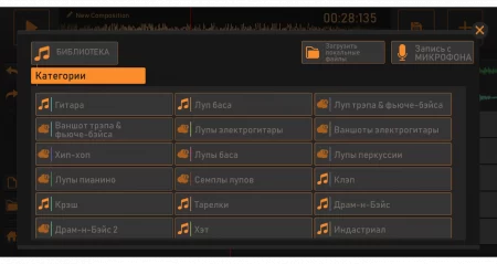 Стоит отметить, что в приложении есть огромное множество самых разнообразных звуковых эффектов, битов и лупов. Все их можно использовать без ограничений, что позволит украсить и разнообразить ваше произведение. К тому же, есть возможность записать собственный голос или вокал, чтобы добавить его в трек, чтобы создать полноценную песню!