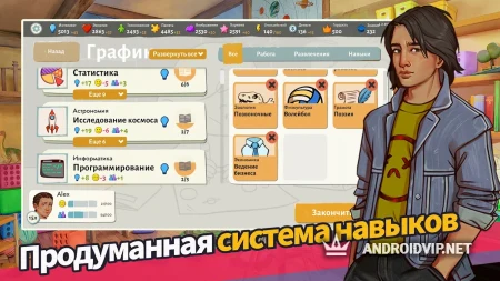 В игре предусмотрена продуманная система навыков и развития персонажа. Вы сами определяйте какими качествами ваш герой будет обладать, какое получит образование и какой карьерный путь его ждёт. Взаимодействуйте с более чем 19 персонажами, жизнь которых будет развиваться наравне с вашей, общайтесь, заводите отношения, посещайте разные мероприятия, устраивайтесь на работу и живите по своим правилам.