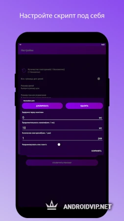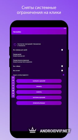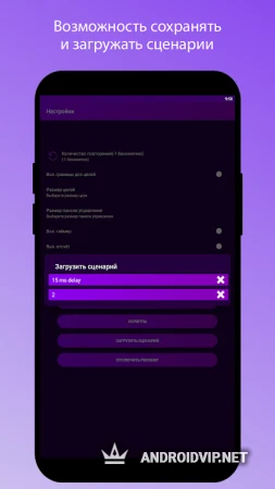 Программа не требует дополнительных рут-прав, снимает все системные ограничения на клики и имеет простое интуитивное управление. После запуска вы можете настроить автокликер под себя задав цель клика, тип касания, продолжительность нажатия, количество повторений и другие свойства. Сохраняйте и загружайте сценарии, меняйте настройки и разруливайте свои рутинные задачи.
