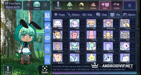 Выбирайте из готовых пресетов классических персонажей и дополнительных, придумывайте для каждого свой уникальный стиль, начиная от причёски, цвета глаз и кожи и заканчивая нарядами, аксессуарами и другими аспектами внешности. Подбирайте для персонажей милых питомцев и кастомизируйте их. Создавайте сценки со своими героями, меняйте позы и добавляйте текст. Играйте в мини-игры, пробуйте разные режимы и сражайтесь в авто-битвах.