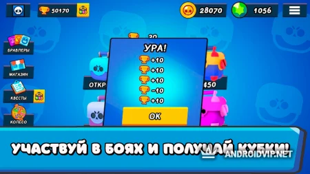 Улучшая своих бравлеров вы будете увеличивать шансы на победу. Для получения дополнительных призов и приятных бонусов крутите колесо удачи, где могут выпасть самые разные награды - 30 гемов, 1000 монет, новые боксы и даже бравл пасс. Вас ждут эти и множество других интересный фичей, которые были созданы специально для фанатов Brawl Stars.