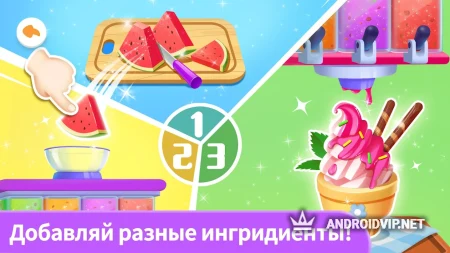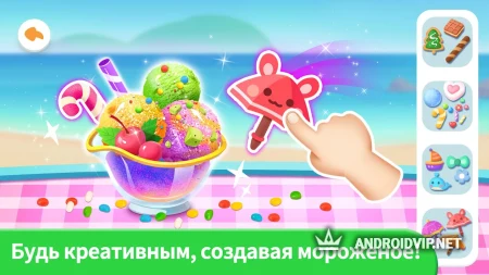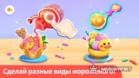В вашем распоряжении будут ингредиенты для создания 4 разных видов мороженого - шоколадного, орехового, фруктового и со вкусом йогурта. Каждое мороженое можно украшать, декорировать и добавлять разные начинки, чтобы делать его ещё более аппетитным. С этой игрой малыши научатся поэтапно готовить вкусные десерты и весело проведут время за интересным занятием.