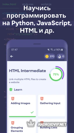 Mimo: научись программировать - это популярное и отмеченное многими наградами приложение, которое уже используют миллионы пользователей по всему миру. Благодаря данному приложению вы сможете начать учиться программированию, освоить самые основы разных языков, научиться создавать сайты, приложения, игры и многое другое!