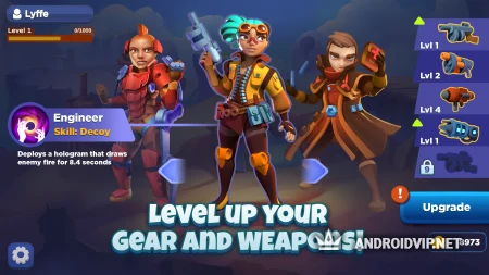 На выбор есть также три персонажа, разделённые по классам. Вы сможете сыграть за инженера Брюнель, медика Досс и за разрушителя Джолта, чтобы наносить внушительный урон. По мере игры получится прокачивать их навыки, вооружать их более мощными пушками и экипировать различными технологичными приспособлениями.