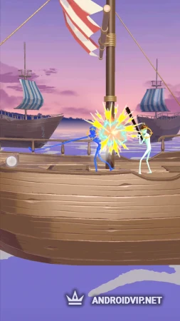 На каждом уровне вы будете открывать всё новые локации, в которых будут проходить сражения - крыша огромной многоэтажки, палуба корабля, зелёное поле рядом с озером и так далее. Так же со временем для стикмена появятся различные красочные скины, которые помогут отличить вас отпротивниками и сделать внешний вид оригинальным.
