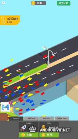 Всего вы сможете задействовать три основные бригады - жёлтые, красные и синие, каждая из них специализируется на определённом этапе строительства. В процессе вы сможете распределять заработанные средства вкладывая их в развитие и увеличение штата каждой из команд, а также увеличения скорости их работы. Стройте мост быстрее и эффективнее, а улучшайте его при помощи заборов, арок и изгородей.