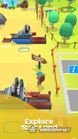 Постройте несколько вариантов для проживания или выделите для них необходимые места - установите палатку, постройте хижину и бунгало, а также просторную парковку для транспорта посетителей. Добывайте дерево для поддержания костров, откройте платные туалеты, установите фудкорты, предоставьте возможность проката каноэ и так далее. Развивайте кемпинг, улучшайте имеющиеся постройки и зарабатывайте.