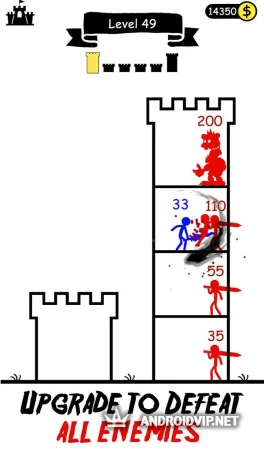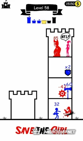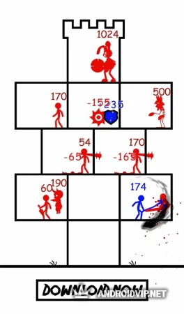 На каждом уровне, вам в основном нужно будет вычищать различные виды зданий в форме башен. Все они разделены на несколько помещений разных размеров, и в каждом из них находится какой-либо противник. Вам же понадобится перетаскивать героя с одного помещения в другой, где он уже самостоятельно будет сражаться с врагами. Только перед тем как отправить его в бой, посмотрите на числа у противников, отображающие их силу.