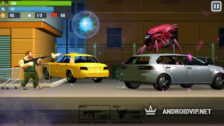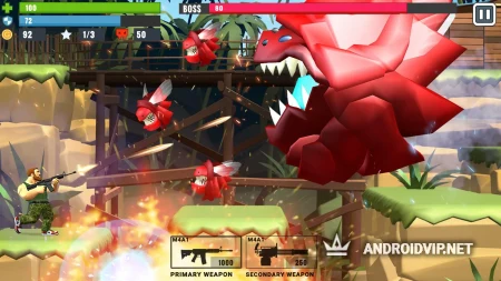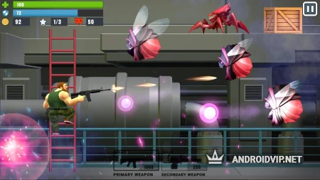 Управление в игре стандартное, где есть джойстик для передвижения, кнопка для выстрела, прыжка, пинка и броска гранаты. Графика же довольно простая, с трёхмерными модельками и красочными ландшафтами. Противники в игре бывают разнообразные, и каждый из них обладает уникальными навыками, к чему стоит быть готовым!
