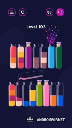 На каждом уровне, перед вами будет несколько сосудов с несколькими жидкостями разной плотности, от чего все они держатся на своём уровне, и создают красочные полоски. Вам же понадобится переливать краски из одной ёмкости в другую, чтобы в итоге в каждой колбе был только один цвет. Но иногда будут встречаться пустые сосуды, куда можно временно заливать мешающие вам краски.