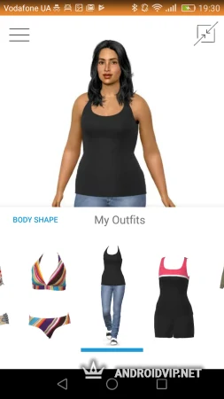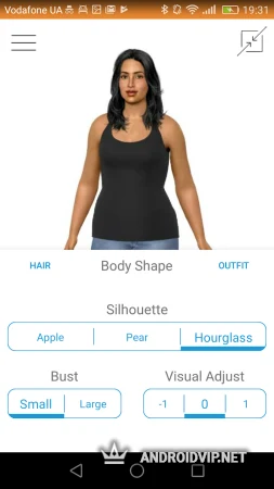 В приложении представлен удобный редактор с виртуальной моделью, основанной на тысячах реальных 3D снимков, которую можно изменять меняя различные параметры. Создайте свою мини-версию и задайте необходимые параметры - имеющиеся на данный момент и желаемые. Среди множества параметров вы можете указать рост и вес, индекс массы тела, форму тела (песочные часы, яблоко, груша), размер груди и так далее.